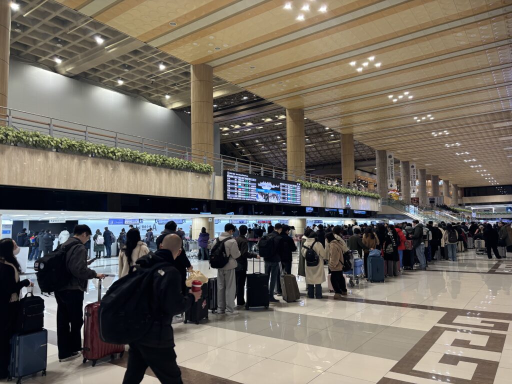 飛行機に乗る前の手荷物検査もえげつないくらい混雑してました。
